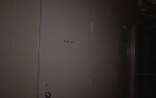 我们上到二楼,走廊一侧有两个房间,一个是男厕所,另一个写着请勿入内。 这时我们听到了脚步声,是有人正在上楼,可我们刚刚从楼下上来,楼下应该没有人才对。 我们决定躲起来。